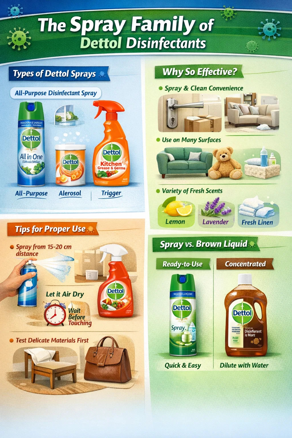 لدى ديتول بالفعل مجموعة من منتجات الرش المطهرة. في حين أن معظم الناس على دراية بالسائل المطهر البني، فإن ديتول لديه في الواقع "عائلة رذاذ" كاملة.